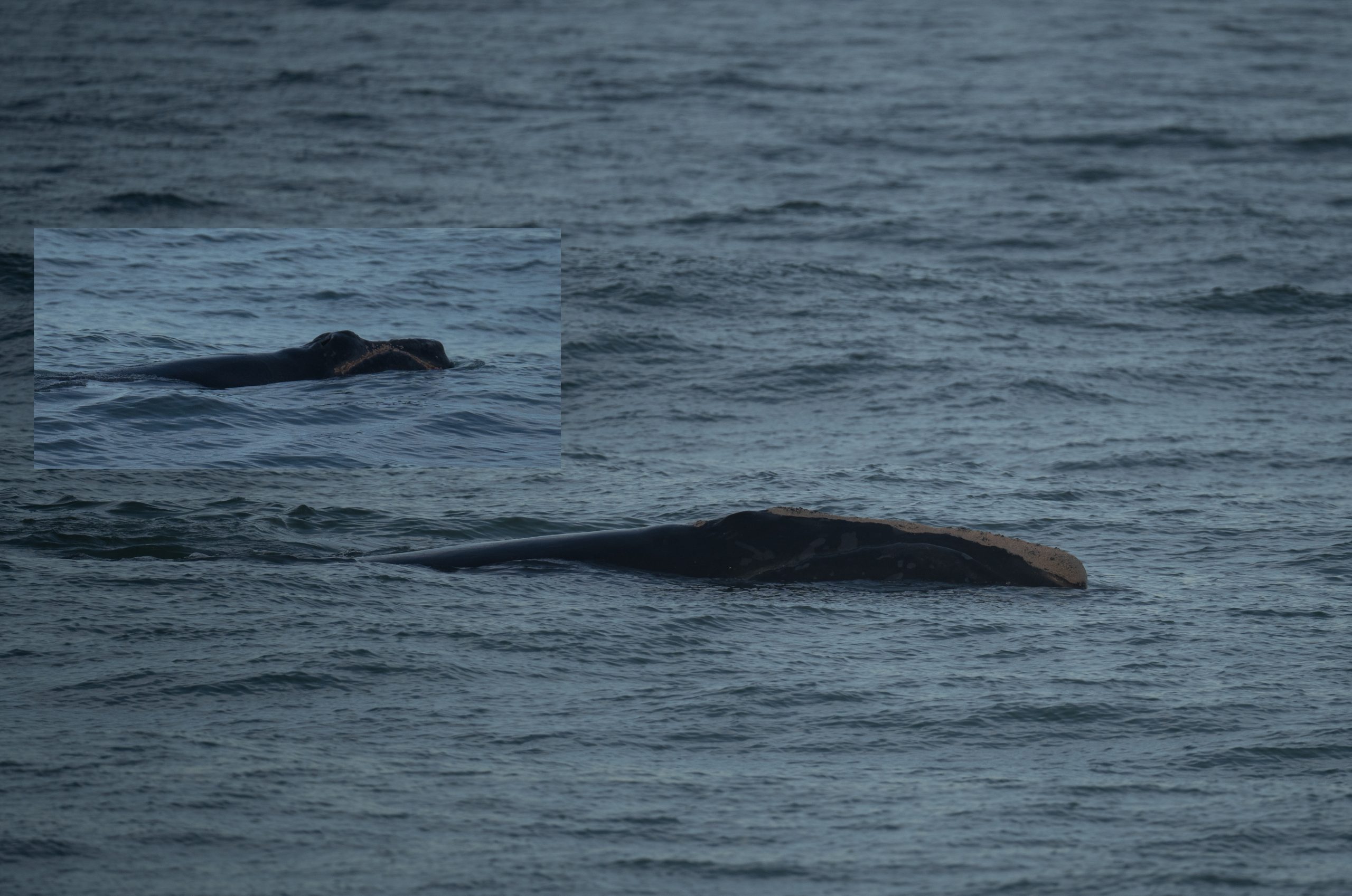 A composite image of “Pilgrim” (Catalog #4340) and calf, sighted by beachgoers off Canaveral, FL on December 30. Photo credit: Photo taken from land by Joel Cohen/Marine Resources Council